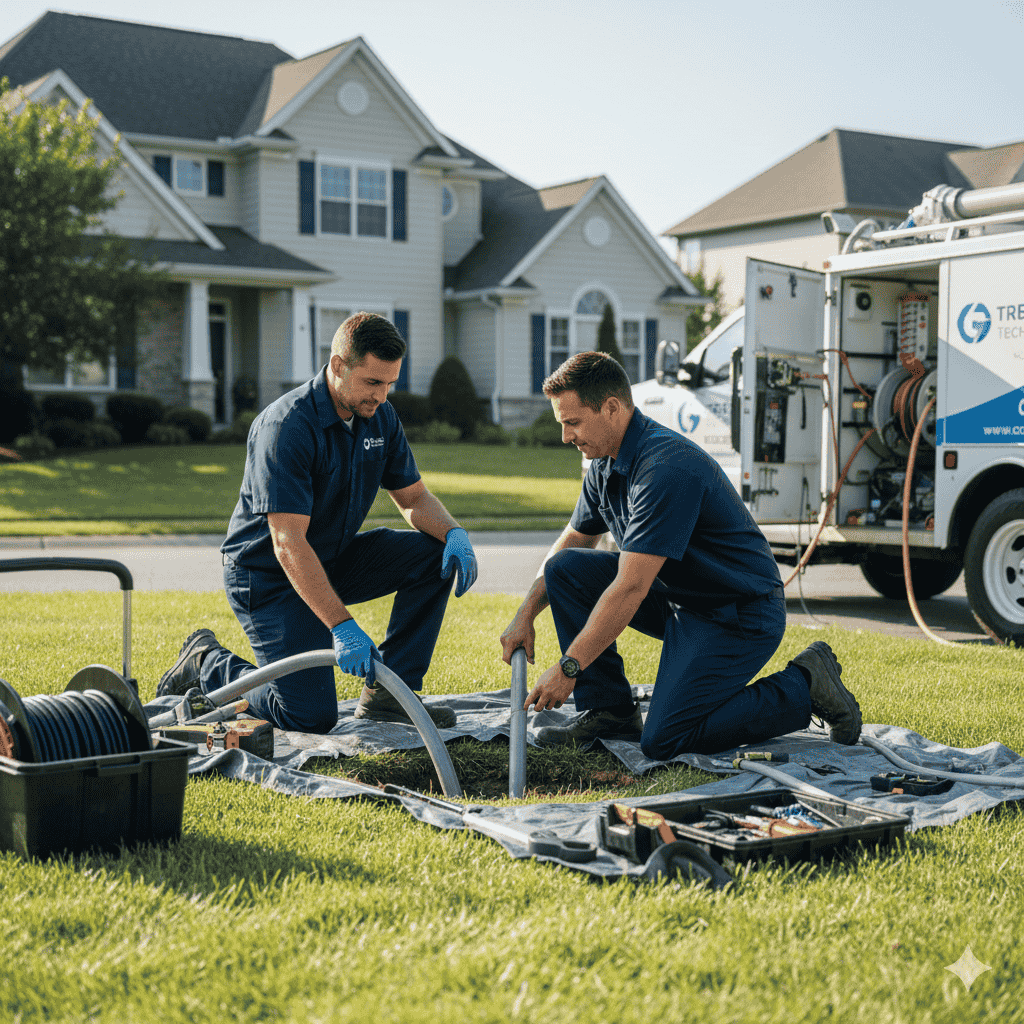 Professional trenchless sewer repair crew using CIPP lining technology to fix damaged residential sewer line in Richardson, TX